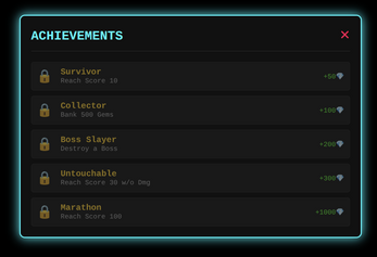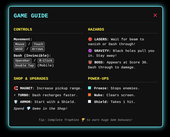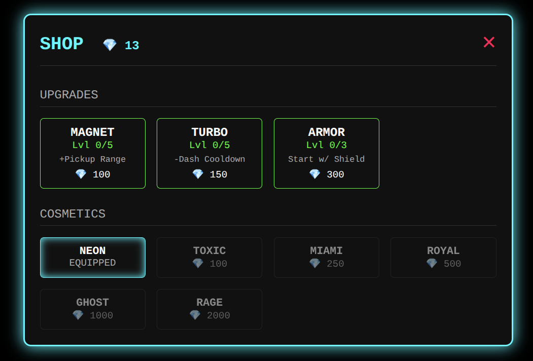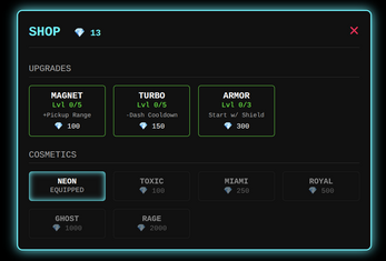 - โพ๏ธ Roguelite Progression: Death is not the end! Bank your collected Gems to buy permanent upgrades like Magnet Radius, Dash Cooldown, and Start Shields.